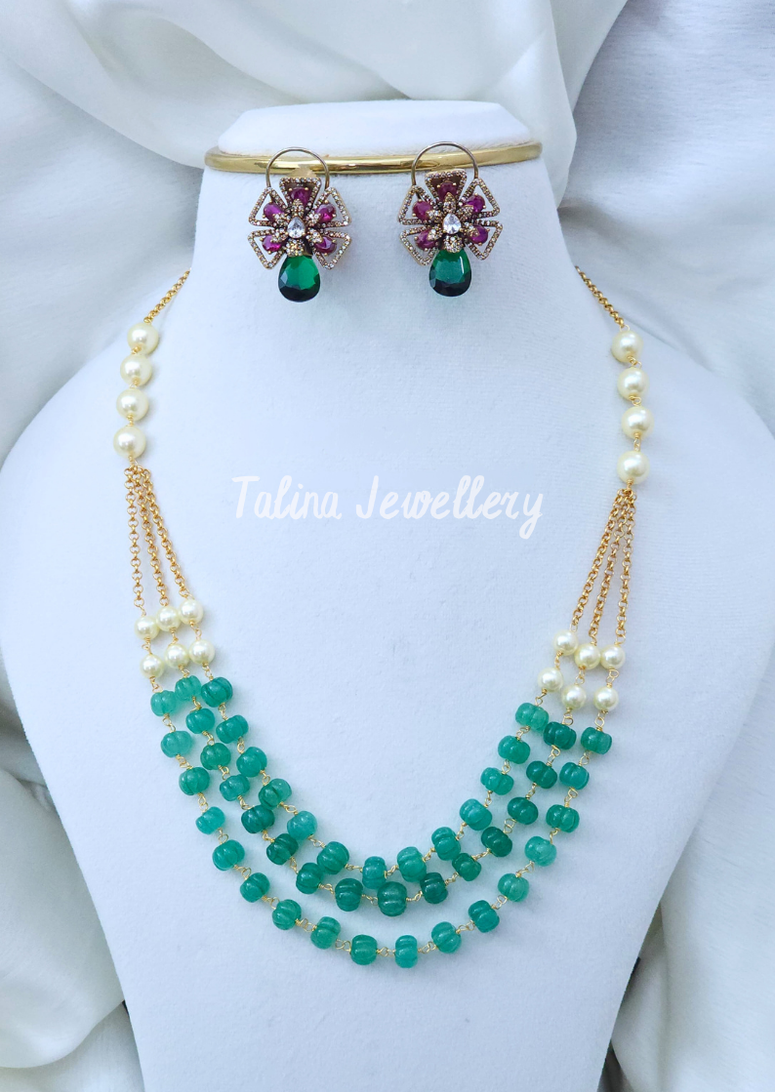 Triple-strand “steps” haram: Hand-linked pumpkin-shaped mossanite beads in a vibrant emerald hue cascade gracefully in three graduated rows.